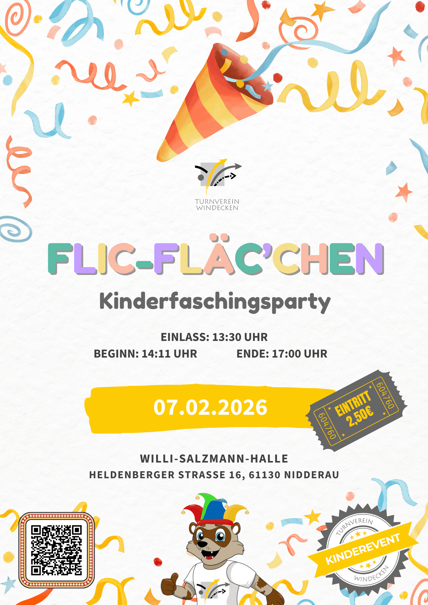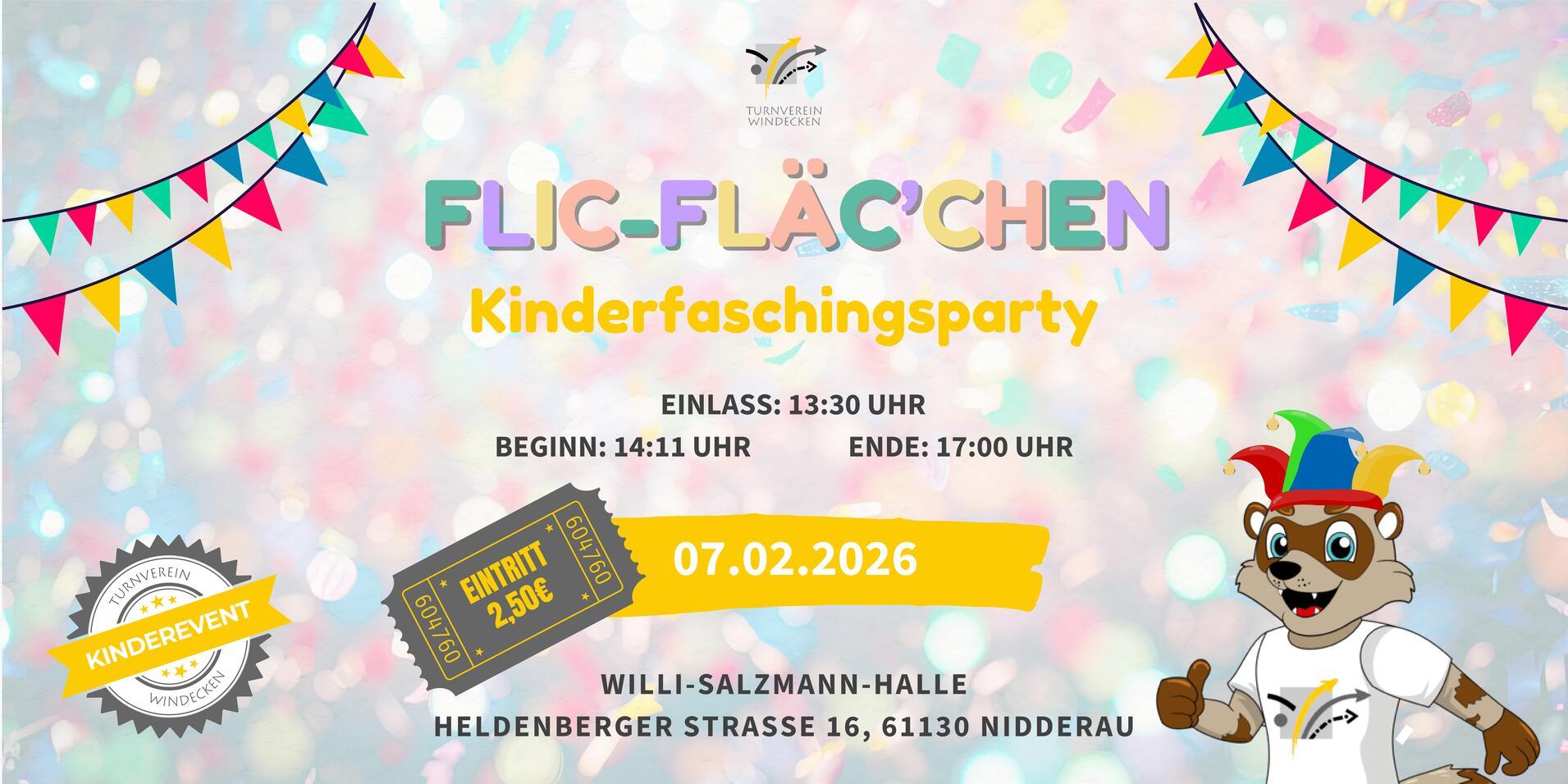 Um 14:11 Uhr (Einlass 13:30 Uhr) beginnt das Flic-Fläc'chen, die Faschingsparty für Kinder!